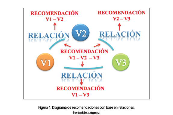 En la figura 4 se presenta la manera de inferir recomendaciones, teniendo en cuenta las relaciones entre datos y considerando las posibles combinaciones de sus valores.