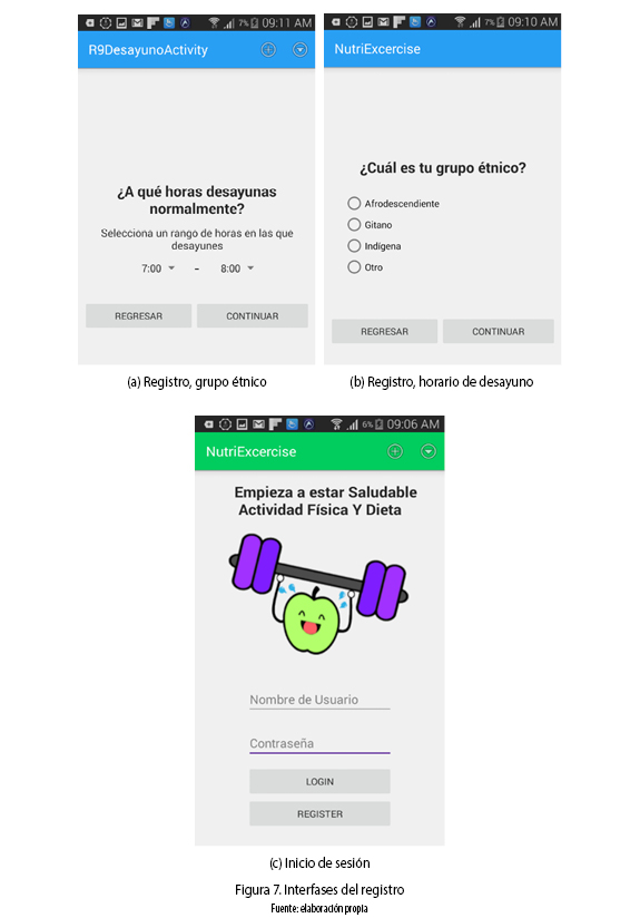 Registro de usuario: en la parte inferior de la figura 7c se observa el botón de registro de usuario; en este punto se obtienen datos esenciales para la personalización como: grupo étnico, si el usuario posee NFC en su celular y horarios habituales de comidas en la mañana, tarde y noche, datos que son almacenados por medio del servidor de bases de datos para que sean almacenados en las bases de datos del contexto y del usuario según corresponda. Después de realizado el registro el usuario procede a realizar su inicio de sesión. En la figura 7a y 7b se aprecian dos interfaces del registro y en la figura 7c, la interfaz de inicio de sesión.