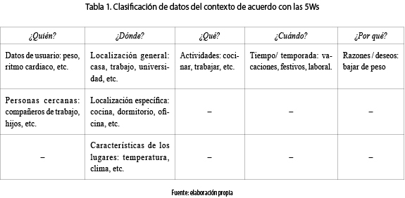 Los datos del contexto se clasifican en 5 grupos, de acuerdo a las5W [7]. En la tabla 1 se muestra la clasificación de los datos que es necesarios obtener, para que el sistema pueda recomendar al usuario la mejor intervención TIC. Para este artículo se tienen en cuenta los datos asociados a actividad física y nutrición saludable; pero la figura puede ser usada para cualquier tópico en el área de la salud.