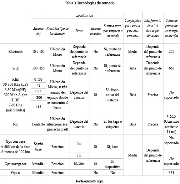 Las tecnologías que permiten sensar algunos de los datos mencionados en la tabla 1, son: GPS, RFID, NFC, Bluetooth y Wi-Fi. Al realizar la comparación entre estas tecnologías, como muestra la tabla 3 se concluyó que: