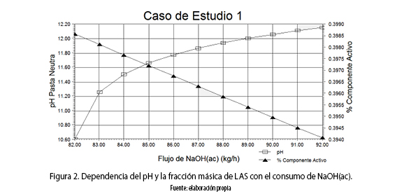Para ello a la entrada del neutralizador se debe regular el flujo de solución de hidróxido de sodio en el cabezal de la bomba triple que corresponde a este reactivo. En la variante se analiza cómo la variable independiente (flujo másico de NaOH) influye sobre las variables dependientes (pH y fracción másica de componente activo). En este caso la variable independiente varía en un intervalo cuyo límite inferior es de 82 kg/h y el superior de 92 kg/h, tomándose un paso de 1,00 kg/h. Los resultados de este caso de estudio se muestran en la figura 2.
