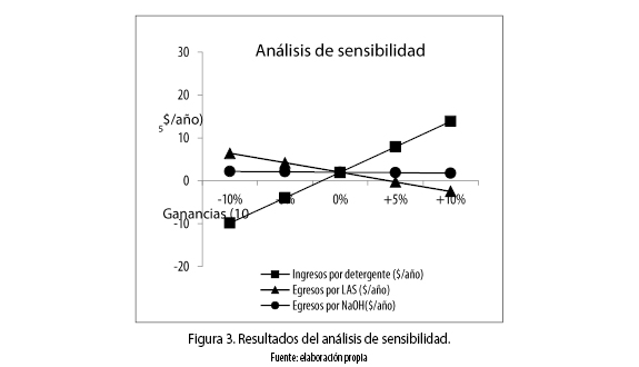 Para profundizar en el análisis económico, en la alternativa de mayor ventaja, se realizó un análisis de sensibilidad de la ganancia ante la variación de los ingresos por venta de detergente y los egresos por concepto de ADBS e hidróxido de sodio. Para ello se definió como variable dependiente la ganancia y se consideraron cinco valores de cada variable independiente: el valor esperado (0 %), un valor optimista (+5 %), otro pesimista (-5 %) y valores extremos optimista (+10 %) y extremos pesimista (-10 %). Puede observarse en la figura 3, que la ganancia es sensible a todas las variables independientes analizadas, pero la mayor sensibilidad aparece ante la variable ingresos por venta de detergente que obtengan.