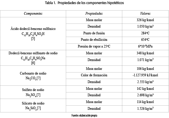 En la base de datos del simulador HYSYS versión 3.2 no aparecen varios de los compuestos que intervienen en el proceso; por ello fue necesario crearlos como componentes hipotéticos. Los componentes creados, así como las propiedades que se tuvieron en cuenta, se muestran en la tabla 1.