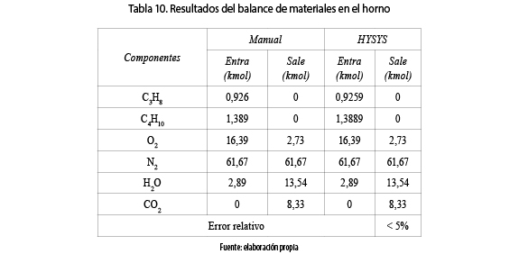 En la tabla 10 se presenta el resultado del balance de materiales en el horno.