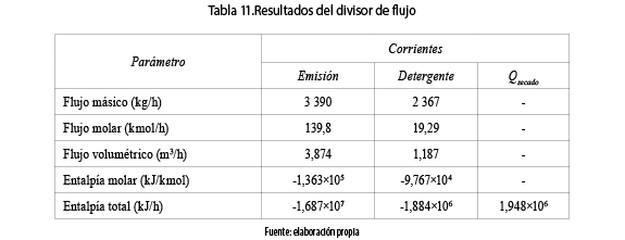 Para verificar la validez de representar la torre de secado por el módulo Divisor de flujo se calculó el agua evaporada en el proceso (973,73 kg/h) y se comparó con la reportada por el simulador (976,97 kg/h), de donde el error relativo en la estimación es menor que 5 %.