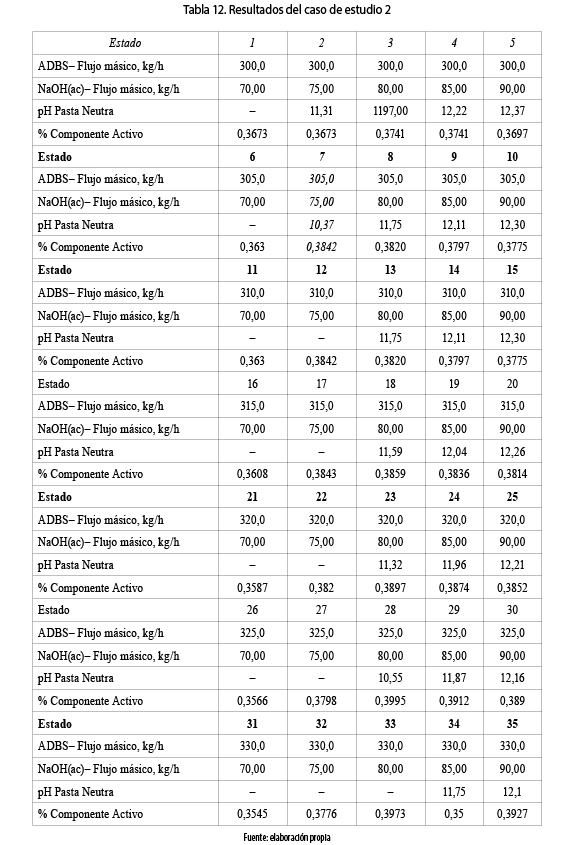 Los resultados del caso base muestran que el pH de la pasta neutra, como el porcentaje de componente activo (% LAS) se encuentran fuera de especificaciones; de ahí que se estudiaron dos variantes tecnológicas para mejorar estos resultados. La variante tecnológica analizada consistió en disminuir el flujo de la solución de hidróxido de sodio alimentada al neutralizador hasta 82 kg/h.
