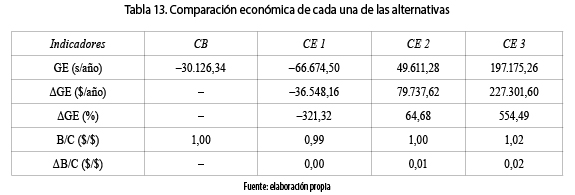Para llevar a cabo el análisis económico se determinó para cada alternativa la ganancia económica (GE), así como la relación beneficio costo (B/C) tomando como punto de partida los costos por concepto de materias primas y utilidades, así como los ingresos por concepto de detergente. Los resultados se muestran en la tabla 13.