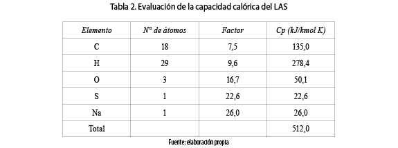 Para la determinación de las capacidades calóricas del ADBS y del LAS se utilizaron dos métodos de contribución de grupos dados por [8].