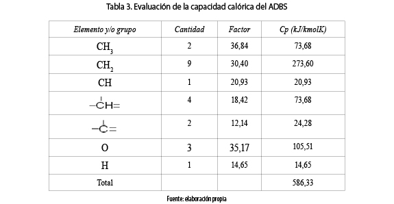 Método 2: contribución de grupos de Chunch y Swanson (1973) para líquidos orgánicos. En este caso la capacidad calórica del compuesto se obtiene a partir de la sumatoria de la contribución de un factor reportado para cada grupo funcional (CH3, CH2, CH), por el número de veces que aparece dicho grupo en la estructura. Este factor depende del estado de agregación del compuesto en cuestión. En la tabla 3 se muestran los resultados de la aplicación del método.