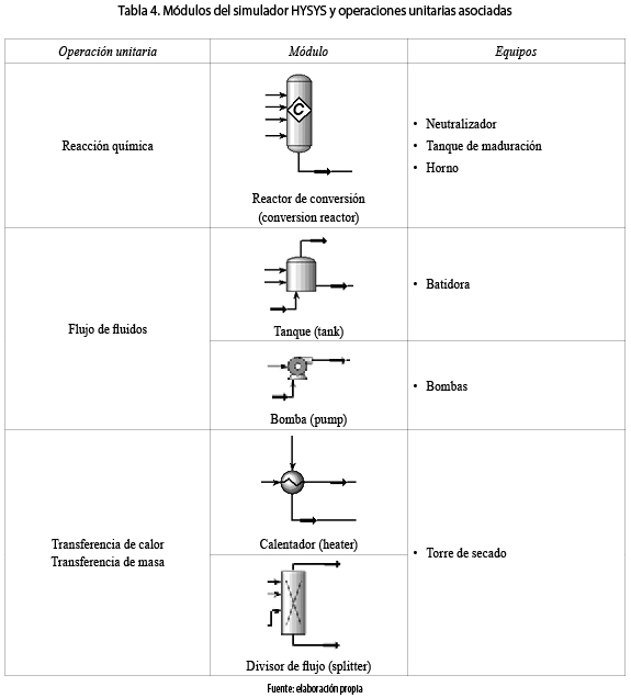 En la tabla 4 se muestran los módulos empleados para simular las diferentes operaciones unitarias presentes en el proceso, así como los equipos asociados a estas.