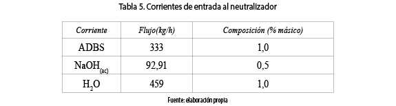 Para la simulación de esta operación se crearon tres corrientes de entrada con sus correspondientes variables de decisión, todas a 25°C y 101,3 kPa, que corresponden a los reactivos (ADBS y NaOH(ac)), así como una corriente de agua. Las especificaciones se muestran en la tabla 5. Por otra parte se creó una corriente de salida (LAS) con una temperatura de 55°C y presión de 101,3 kPa. También fue añadida una corriente de energía (Qperdido) de manera que el simulador determinase la energía cedida en el proceso. La corriente de salida del neutralizador constituye la entrada a un segundo reactor de conversión el cual es el equivalente al tanque intermedio descrito en el proceso. En este caso solo se fijó la presión a la corriente de salida.