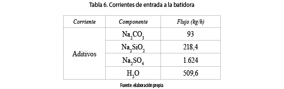 (3)Para la simulación de esta operación se tienen dos corrientes de entrada. Una es la salida del tanque intermedio y otra se creó teniendo en cuenta los consumos de materias primas en la etapa (aditivos). La temperatura y presión de la corriente de Aditivos es 25°C y 101,3 kPa, respectivamente. En la tabla 6 se muestran las especificaciones de la corriente creada.