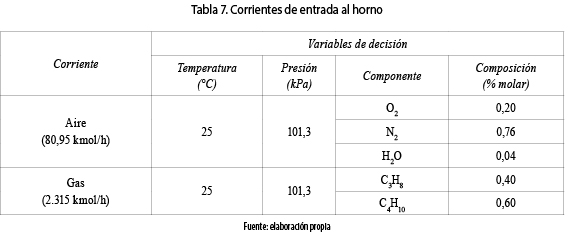 Para la simulación de esta sección se crearon dos corrientes de entrada al reactor cuyas especificaciones se muestran en la tabla 7. Además de las corrientes de entrada se creó una de salida (gas secado) donde las únicas especificaciones hechas fueron las de temperatura y presión (400°C y 101,3 kPa). Al igual que en el resto de las operaciones descritas anteriormente se conectó al reactor una corriente de energía (Q) de manera que se calculara el calor cedido al medio.