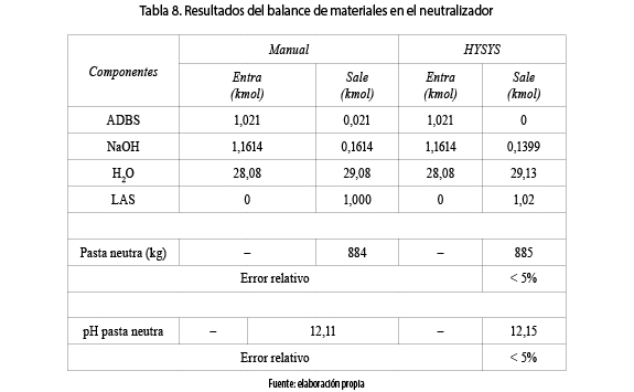 En la tabla 8 se muestran los resultados del balance de materiales en el neutralizador y el cálculo del pH obtenido manualmente y a partir del simulador. Los cálculos manuales se realizaron con el objetivo de validar el modelo de simulación.