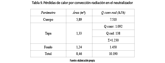 Para el cálculo de las pérdidas de energía en el neutralizador se estimó la energía cedida por convección y radiación (Qconv, Qrad). Estos valores se muestran en la tabla 9. No fue posible verificar el resultado de los balances de energía con el simulador, por no haber posibilidades de realizar mediciones experimentales que permitieran corroborar los estimados de propiedades energéticas de los componentes hipotéticos.