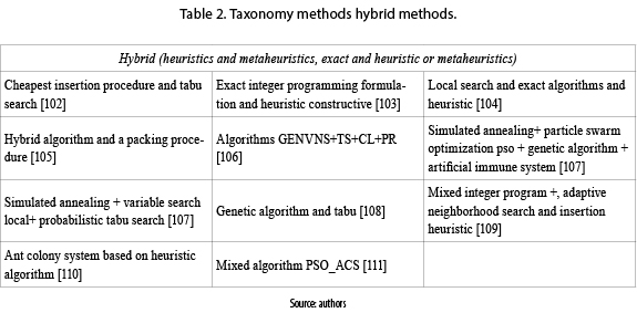 Eleven hybrid methods found in the papers consulted, combining metaheuristics and exact methods heuristics to obtain better solutions to the problem are presented in table 2.
