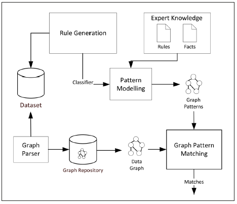 Considering the use of rulesets in expert systems, drawn from the knowledge produced by experts and extracted through data mining techniques, it is possible to represent each rule as a graph pattern. More specifically, the ruleset can be defined as a set of graph patterns R = (R1,,…, Rn). Thereby, we can define Graph Pattern Matching approach as follows: “given a data graph G, and a set of patterns R, find all matches of R in G”. This process finds the sub-graphs M (RG) that comply with the conditions established in each rule. Moreover, the graph pattern concept sup ports the interaction of the domain expert (being able to express his/her current level of knowledge) and can be used with data mining techniques to improve the pattern construction 38.