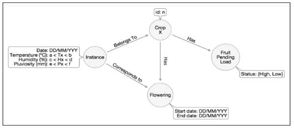 The graph pattern shown expresses the different conditions contained in one of the rules produced by experts and extracted by the Rule Generation module. Moreover, graph-based representation relates entities from different domains such as Instance, related to meteorological information taken at a specific date and containing ranges of climatic variables and including the Flowering entity, related to a property of the coffee crop. In a traditional representation of rules, a rule is required for each domain, resulting in a large ruleset where the maintenance operation may result in an incon sistency, as well as in unstructured rules 33.