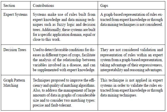 In the previous section a revision of the state of the art about expert systems and graph pattern matching was presented. For expert systems, the search query was bounded to “crop disease expert systems” in order to find research that pointed to the development of these systems for prevention and treatment recommendation of diseases in differ ent crops. Most proposals presented in the papers mentioned make use of inference engines based on rules to analyze the problem’s characteristics and create a solution or suggestion. Thus, knowledge from experts is modeling through ‘‘if then...else’’ rules form. However, there are some research approaches that consider the use of artificial intelligence techniques, like decision trees to classify data involved in the problem addressed and to generate new knowledge that may be used by the expert system.