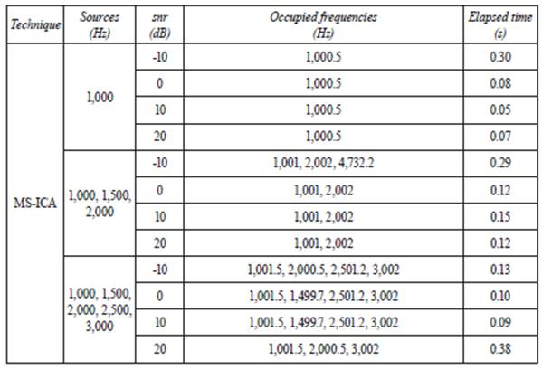 The proposed ms-ica technique exhibits a suitable compromise between time and performance. The algorithm is fast enough to sense without causing long interrup tions in transmissions. The major disadvantage is the misdetection of some sources. To overcome this inconvenient, it is recommended to run the algorithm a couple of times and increase the amount of information about the frequency occupancy. The remarkable aspect is the elapsed time (0.15 ± 0.1 s), especially for online applications with demanding time issues.
