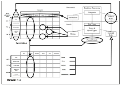 La Figura 2 expone el mapeo de la taxonomía Zachman con la taxonomía Backbone. Para este caso, los formal roles se asignan a los roles asociados a las perspectivas. Los material roles son aquellos que participan en el acto mismo de modelado (ya sea en el modelado o en la definición/soporte a un lenguaje de modelado), como experto en negocios, analista de sistemas, diseñador, arquitecto, desarrollador, etnógrafo, experto en seguridad y otros. Estos son definidos como roles asociados a puntos de vista que heredan atributos desde los roles de las perspectivas nativas Zachman. Las phased sortals se refieren a los diferentes tiempos en los que se puede realizar el análisis taxonómico. Para este caso, tenemos análisis temporal cuando los modelos se cruzan entre los niveles de abstracción CIM-PIM-PSM. Otros phased sortal ocurren cuando el marco se aplica en etapas posteriores del proceso de modelado en el tiempo, por ejemplo, para comprobar el progreso del modelado y desarrollo del sistema de informa ción. Las attributions son definidas por el modelo esencial de cada punto de vista y la coherencia semántica de la cada abstracción / perspectiva. Ambos elementos prescriben los atributos de los artefactos de modelado que se encuentran bajo clasificación. Los mixins son la combinación de abstracción / perspectiva y puntos de vista propiedades en forma de celdas.