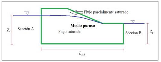 Para simular la presencia de nivel freático, en cada talud se define una zona saturada, abajo del nivel freático y una zona parcialmente saturada, arriba del nivel freático. La zona saturada es gobernada bajo la ley de Darcy donde se establecen dos alturas piezométricas para lograr un flujo estacionario a lo largo del talud. La zona parcialmente saturada es representada por la ecuación analítica propuesta por Van Genuchten 12.