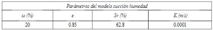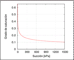 Para establecer la condición de saturación parcial se conformó la curva de retención de humedad por medio de la ecuación analítica propuesta por Van Genuchten (ecuación 6) 12, que relaciona el grado de saturación y el esfuerzo de succión en el medio poroso. En la Tabla 3 se definen los parámetros de la ecuación de Van Genuchten 13. La Figura 2 muestra la relación succión-grado de saturación resultante de la aplicación del modelo mencionado.