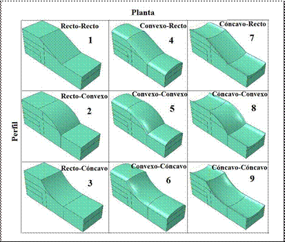 Con el objetivo de analizar el efecto de la geoforma en la estabilidad de taludes se simularon 18 modelos de taludes: nueve modelos en términos de esfuerzos totales y nueve en términos de esfuerzos efectivos. En la Figura 3 se observan las 9 geoformas analizadas. Las geoformas son producto de combinar la disposición en planta y en perfil recto, cóncavo y convexo.