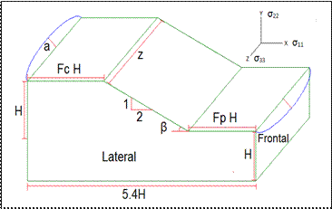 El estado de esfuerzos inicial fue del tipo geoestático simulando la conformación del talud por etapas sucesivas de carga. En las condiciones de frontera se restringieron los desplazamientos en los nodos: en la componente (X) para las caras frontales, en la componente (Y) para la base del talud, y en la componente (Z) para las caras laterales. El sistema coordenado se observa en la Figura 4. Para lograr la conformación del nivel freático en cada talud, se seleccionó un flujo estacionario donde se definieron dos alturas piezométricas de 35 y 15 metros en los costados frontales del plano (YZ) según la Figura 4.
