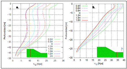 Las Figuras 5a y 5b muestran la variación de los esfuerzos de corte en una sección en la corona y en la pata del talud, respectivamente, en función de la altura H del talud (figura 4). La altura H del talud se fijó con valor de 25 m. Se observa que para fronteras cercanas a la pata y a la corona del talud (0.4H a 1.4 H) se presenta variación significativa de los esfuerzos de corte en profundidad. Para valores de distancia de la frontera izquierda a la corona de los taludes superiores a Fc=1.8H no se observa cambio representativo de los esfuerzos de corte (Figura 5a). Comportamiento similar se presenta para la pata del talud con distancias mayores a la frontera derecha de Fp=1.6 H (Figura 5b).