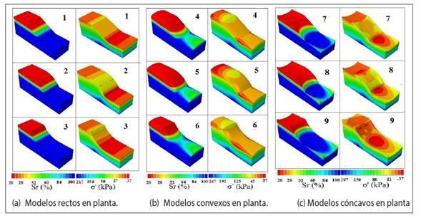 En términos de esfuerzos efectivos se analizó la distribución de los esfuerzos y grados de saturación a lo largo de cada talud en una vista en planta. En la Figura 6 se presentan los contornos de grados de saturación y el valor del máximo componente del tensor de esfuerzos para cada modelo. El número de cada modelo corresponde al mostrado en la figura 3. En los modelos rectos en planta (Figura 6a) se presenta un comportamiento uniforme en el grado saturación de la pata del talud. El efecto de la geoforma en la condición espacial tridimensional se observa predominante en los modelos convexos y cóncavos. En los modelos convexos (Figura 6b) se evidencia un comportamiento divergente de las líneas de flujo del centro de simetría del talud reflejado en saturación del 100% en la pata y extremos del mismo. Estas zonas tienen bajas profundidades por lo que las presiones de poros generadas por la dinámica del flujo hacen que se presenten esfuerzos efectivos negativos, encontrándose que la resistencia al corte en estas zonas es muy baja con relación a la parte central del talud. Situación contraria ocurre en modelos cóncavos en planta (Figura 6c). En estos modelos se presenta convergencia de las líneas de flujo en el centro de la parte baja del talud generando saturaciones del 100%, de forma tal que los esfuerzos efectivos son bajos en esta zona y se espera que la resistencia del talud esté modulada por la propagación de la falla a partir de esta zona.