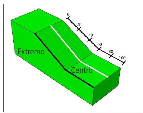 Para poder analizar de mejor manera las diferencias en los esfuerzos que genera la condición tridimensional observadas en la Figura 6, se seleccionaron dos líneas de análisis (extremo y centro) (Figura 7).