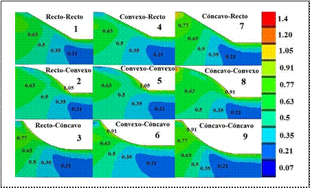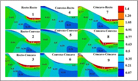 Los modelos convexos en perfil en la Figura 8 (modelos 2, 5 y 8) presentan indicadores cercanos o superiores a 1.0 en la pata del talud, a diferencia de modelos cóncavos (modelos 3, 6 y 9), los cuales presentan altos indicadores en la corona del talud. Es decir, la geoforma cóncava o convexa genera concentración de esfuerzos de corte debido a la no homogeneidad en perfil. Los modelos con geoformación en perfil presentan indicadores más bajos que los anteriores (modelos 1, 4 y 7). Lo anterior indica que para taludes sin presencia de agua, los modelos con geometría recta en perfil son más estables en comparación con modelos cóncavos y convexos. Si se espera que se genere una falla del tipo progresivo, en el talud con perfil convexo iniciará en la parte baja del talud y se propagará hacia arriba dado que los contornos de mayores valores se ubican inmediatamente arriba de los puntos de concentración del indicador Փ. Por otro lado, en los taludes de perfil cóncavo, aunque hay concentración de valores altos del indicador Փ cerca de la corona del talud, es más difícil que se desarrolle una falla progresiva hacia la pata del talud, dado que hacia debajo de la corona los valores del indicador son más pequeños, haciendo más difícil la propagación de la superficie de discontinuidad. Ninguno de los taludes en estado seco alcanza un indicador mayor a