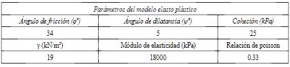 Los parámetros del modelo constitutivo elasto-plástico se definieron con base en valores típicos de arenas limosas propuestos por Puri y Bowles 10)-(11 (Tabla 1).