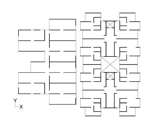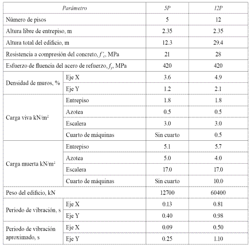Los edificios de este estudio están conformados por muros sin cambios significativos de rigidez en su altura, sin aberturas en ellos, con espesores que varían entre 120 mm y 150 mm, y muros de sección recta; es decir, que para la flexo-compresión no se tendrá en cuenta el aporte de las aletas formadas por la intersección de dos muros. La altura libre de entrepiso de los dos edificios es de 2.35 m y el espesor de la losa maciza de entrepiso es de 100 mm. Los sistemas industrializados suelen generar una composición estructural tal que en una dirección permita separaciones que varían entre 2.5 m y 3.5 m, con el objetivo de utilizar losas de entrepiso con espesores que varían entre 100 mm y 120 mm, y que funcionen con refuerzo mínimo, señalan Mayagoitia et al.4. Esto implica que en uno de los sentidos de la planta se tendrá mayor densidad de muros en comparación con la dirección ortogonal. En la figura 1 se muestra un esquema de la planta de cada edificio. En la Tabla se muestra un resumen de las características de los edificios estudiados. En la tabla, la densidad de muros, evaluada en cada dirección, corresponde a la relación entre el área total de muros por planta y el área de la planta. El f’c usado en cada edificio corresponde a valores típicos para la altura de cada edificio, debido a que este es un parámetro que influye en todo el diseño estructural.