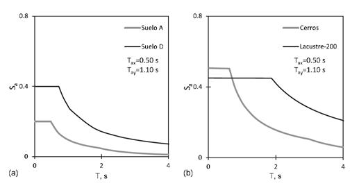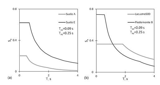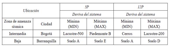 Para seleccionar los tipos de suelo que se utilizarían en el estudio, los edificios se modelaron y analizaron para todos los posibles espectros de cada zona (diferentes tipos de suelo). Para cada edificio, en cada zona de amenaza sísmica (baja e intermedia), se escogieron los espectros que generaron menor deriva de piso y mayor deriva de piso sin exceder la máxima permisible. De acuerdo con Carrillo et al. (2013) 5, el límite de deriva establecido por la NSR-10 está más relacionado con un indicador de desempeño o límite de control relacionado con el estado límite de servicio. Para estructuras en mampostería estructural, este límite es de 0.5% por la naturaleza frágil de los elementos en este material, y para las demás estructuras es de 1.0%. Cuando en el análisis estructural se usan secciones fisuradas, los resultados de la deriva obtenidos en el análisis se deben reducir a 70%, antes de compararlos con los límites establecidos por la NSR-10. Sin embargo, en los análisis estructurales de este estudio no se usaron secciones fisuradas. Los espectros de diseño elegidos para cada edificio se enlistan en la Tabla 3, y se muestran en las Figuras 2 y 3, respectivamente.