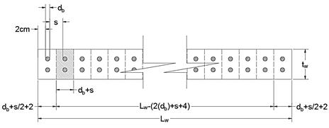 Dado que el sistema constructivo contempla fundir monolíticamente cada piso, el concreto ya endurecido de un piso fundido forma una junta fría con el concreto recién fundido del nuevo piso. Para que el muro se comporte monolíticamente, se debe transmitir el cortante entre las dos caras de la junta. El mecanismo de transmisión se conoce como “transmisión por fricción”, ya que se toma en cuenta la fricción entre las dos caras de la junta para estimar un área de refuerzo según McCormac y Nelson 6, la cual se suple mediante la cuantía longitudinal del alma a cortante. La figura 4 muestra la sección de un muro de longitud Lw, con recubrimiento del refuerzo 2 cm, dividida en n partes, según el diámetro db y la separación s del refuerzo longitudinal.