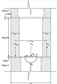 Como se muestra en la Figura 5, el muro en un piso i es sometido a un momento Mui , una carga axial de compresión Pui , y un cortante solicitante Vui. El momento se puede descomponer en un sistema de pares que actúa como fuerza axial en el centroide de cada elemento especial de borde del piso (achurado en la Figura 5), el cual tiene un ancho Cbi relacionado con la profundidad de compresión del muro.