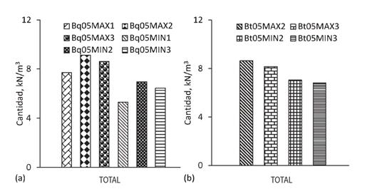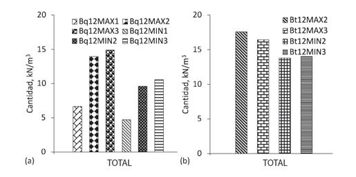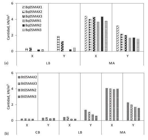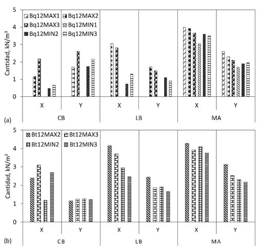 donde 1 indica la ciudad en que se ubicó el edificio, Barranquilla (Bq) o Bogotá (Bt); 2 indica el edificio, 5P(05) o 12P(12); 3 indica el espectro relacionado con la máxima (MAX) o mínima (MIN) deriva (según tablas 2 y 3), y 4 indica la categoría de disipación de energía que se utilizó en el diseño DMI(1), DMO(2) y DES(3). En el estudio se evaluaron las cantidades en los componentes principales del refuerzo de los muros: el refuerzo en el alma, MA; el refuerzo longitudinal de los elementos de borde, LB, y el refuerzo usado para confinar los elementos especiales de borde, CB. En este estudio, el refuerzo en el alma de los muros se suplió usando mallas electrosoldadas. Las Figuras 6 a 9 muestran los resultados de estas cantidades.