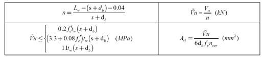 En la tabla 4, n representa la cantidad de segmentos o “bloques” cuyas dimensiones son el espesor del muro tw , y db+s. En cada segmento actúa una fuerza cortante aferente Ṽu , relacionada con la fuerza cortante que actúa sobre el muro en la zona donde se va a formar la junta Vu , obtenido del análisis estructural. El valor del cortante aferente se encuentra limitado con los valores de las ecuaciones que se muestran en la tabla 4. En la tabla, Avl es el área de refuerzo requerida por cada cortina de refuerzo ncor , en cada uno de los bloques. Cuando esta área es menor o igual al área del refuerzo longitudinal, se cumple con la transferencia de cortante.