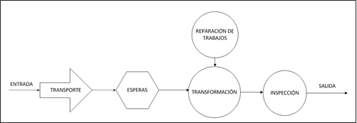 La filosofía LEAN propone un modelo en el que después de la entrada hay un proceso de transporte y esperas antes de llegar a la transformación, luego inspecciones y, en muchas ocasiones, reparación de trabajos, para llegar al producto. Este modelo es llamado de transformación-flujo-valor -TFV (ver Figura 2).