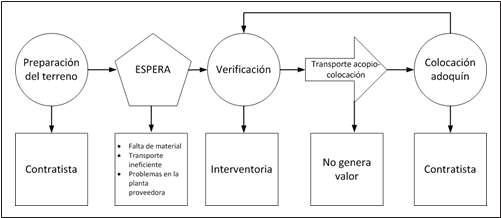 Un ejemplo del proceso de trasformación propuesto se muestra en la instalación de adoquín para la realización de una vía, donde se observan etapas que no estaban contempladas en el modelo inicial, pero que causan desperdicios (Figura 3).