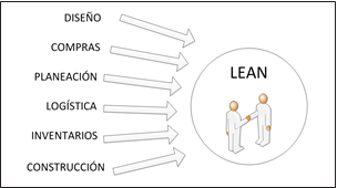 En las etapas para llegar a la construcción de un proyecto, se aplica LEAN en cada una de ellas para optimizar los procesos que se involucran en la entrega final del producto. LEAN se aplica en los diseños, compras, logística, planeación, inventarios y construcción (figura 4) 12.