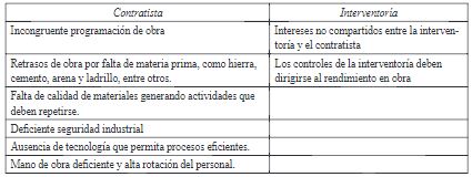 El desperdicio tipo “muda” en la construcción de proyectos se presenta en la interventoría y en la empresa contratista como se muestra en la tabla 1.