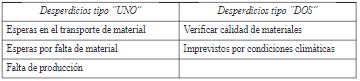 En la Tabla 2 se muestran los desperdicios en la construcción que son necesarios para la entrega del producto denominados tipo “UNO” y los que son netamente pérdidas, llamados tipo “DOS”.