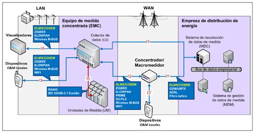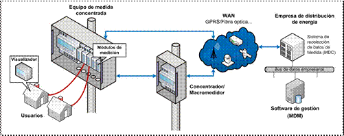 Los equipos de medición concentrada (EMC) son dispositivos de medición inteligente que integran la medida de múltiples usuarios. Generalmente están conformados por una unidad de procesamiento central (colector de datos), módulos de comunicación, módulos de medición de energía eléctrica (unidades de medida) y dispositivos de corte y reconexión. Pueden ser accedidos desde el centro de gestión a través del concentrador/ macromedidor o directamente mediante tecnologías WAN como GSM/UMTS, Fibra Óptica, Ethernet, enlaces microonda, etc.