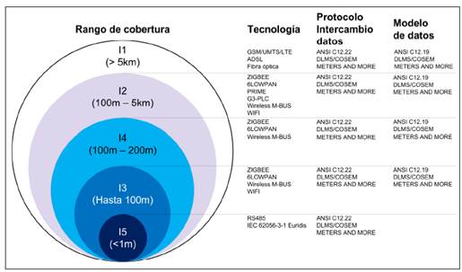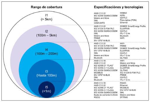 Aplicando los requerimientos de la tabla 1 sobre los estándares de la figura 3, se obtiene la figura 4. Se concluye que no existe una única tecnología que cobije todas las necesidades de comunicación, por lo que su selección dependerá de las características del entorno donde se instalen los SMC y la inclinación de la empresa de servicios públicos en el uso de algunas en especial.