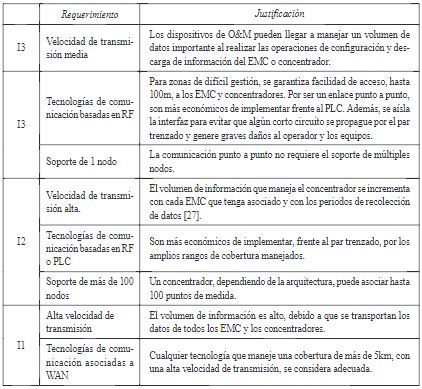En resumen, el volumen de datos transportado en la arquitectura siempre crece a medida que la información viaja hacia el centro de gestión, hecho que exige el uso de canales con una velocidad de transmisión alta comparada con la que necesitan las UM con el CD. Por su parte, el número de nodos requeridos por las interfaces cambia según la cantidad de dispositivos que intervengan en la comunicación. Finalmente, las tecnologías sugeridas en cada caso responden a la relación costo-beneficio que se puede obtener de su implementación.