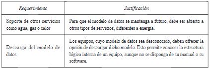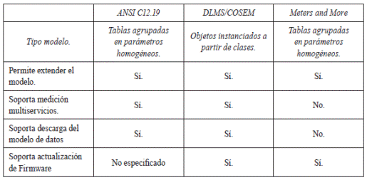 En modelo de datos se encontraron como aptos ANSI C12.19, DLMS/COSEM y Meters and More. Estos modelos se encuentran soportados por organismos internacionales y tienen la capacidad de ser transportados sobre varios medios de comunicación. Sin embargo, para ser coherentes con el planteamiento del artículo, se debe elegir uno de los tres, siguiendo los requerimientos establecidos en la tabla 2.