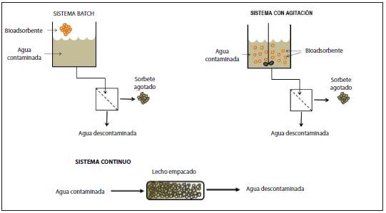 A partir de la tabla 1, se puede concluir que los contaminantes metálicos Pb2+, Cu2+, Cd2+, y el tinte azul de metileno (MB) se eliminan de manera efectiva por piel de naranja (OP), cáscara de plátano (BP), cáscara de granada (PP). La cáscara de ajo (GP) se utiliza de manera efectiva para la eliminación de contaminantes (metales, tintes, y los contaminantes orgánicos) de las aguas residuales dependiendo el proceso de limpieza que se desee dar a un efluente contaminado. Algunos ejemplos de cómo pueden ser adaptados los adsorbentes naturales al tratamiento de aguas residuales se muestra en la figura 3.